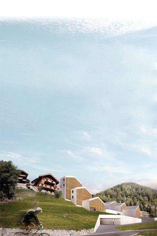 La taille de chaque volume, analogue au bâti voisin, permet au tout de s’intégrer dans le tissu villageois avoisinant. Echelonné dans la pente, le projet met en relation les différentes activités ainsi que les différents accès au site. Les pentes rencontrées sur le terrain structurent le projet ; lui donnent son caractère. Flexibles et multiples les volumes s’organisent pour accueillir le programme. Leur étagement spatial offre un accès par la route Sierre-Zinal ainsi que par la route Sierre-Grimentz.